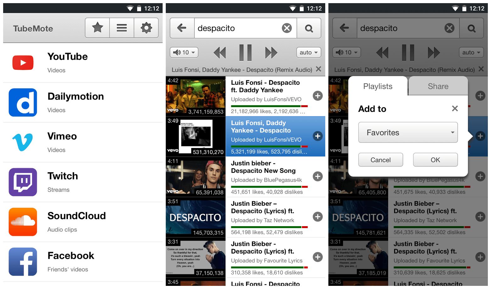 TubeMote is also a best YouTube downloader for Android smartphone to download videos while playing for hot video website such as YouTube, Dailymotion, Vimeo and more. You could even add your videos to favorite playlist or share it to famous social media. As long as you choose YouTube and search keywords on this application, you are about to see related videos from search results. The quite interesting feature is that you are allowed to embed your video channel on your blog (You could also choose another related app named TubeMate running on PC).